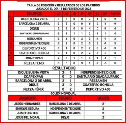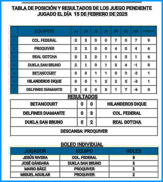 Al momento, Dique Buena Vista lidera la división Premier con 9 puntos en igual número de encuentros, superando en diferencia de goles a Barcelona 2 de Abril, que registra igual acumulción de enteros.