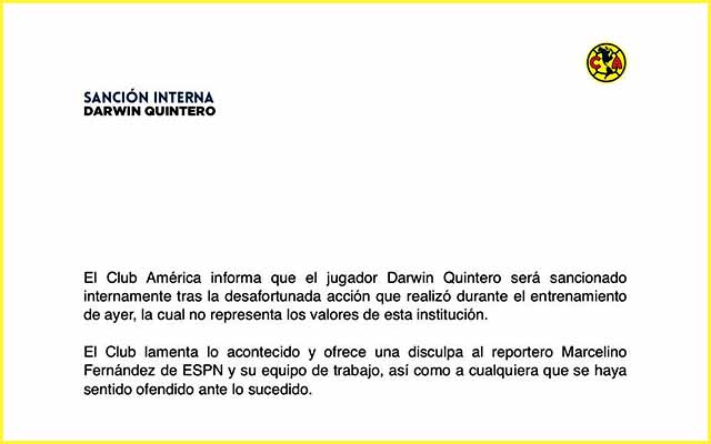 CIUDAD DE MÉXICO, 24 de enero.- La directiva del América anunció la sanción interna al futbolista colombiano Darwin Quintero quien intentó dar un balonazo al reportero de ESPN Marcelino Fernández durante una práctica del club azulcrema.