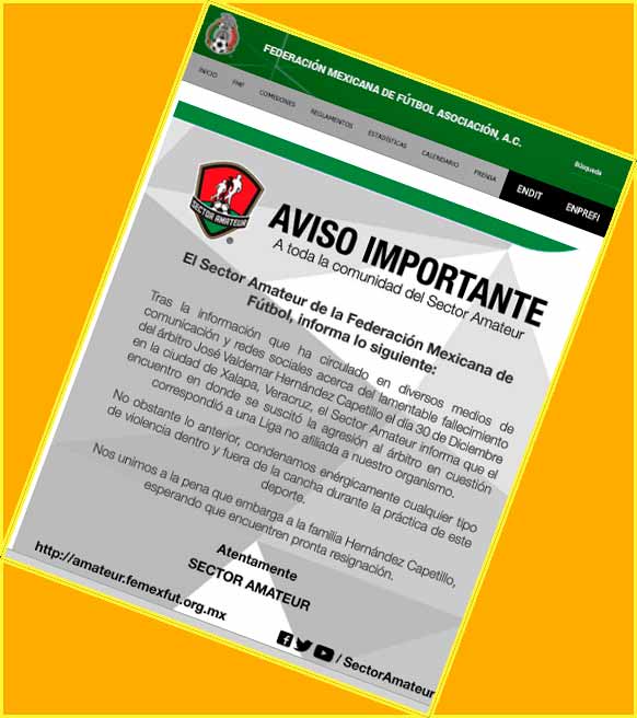CIUDAD DE MÉXICO, 1 de enero.- Al ser una liga no afiliada, la Federación Mexicana de Futbol se deslindó del caso del silbante xalapeño José Valdemar Hernández Capetillo quien fuera agredido y que, tras días de atención médica, perdiera la vida.