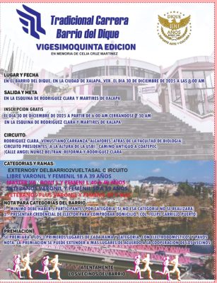 Este evento, que se ha consolidado como una de las carreras más tradicionales de Xalapa, se celebrará el 30 de diciembre de 2025 a las 8:00 de la mañana, teniendo como escenario el histórico Barrio del Dique, cuna de generaciones que han mantenido viva esta celebración deportiva.